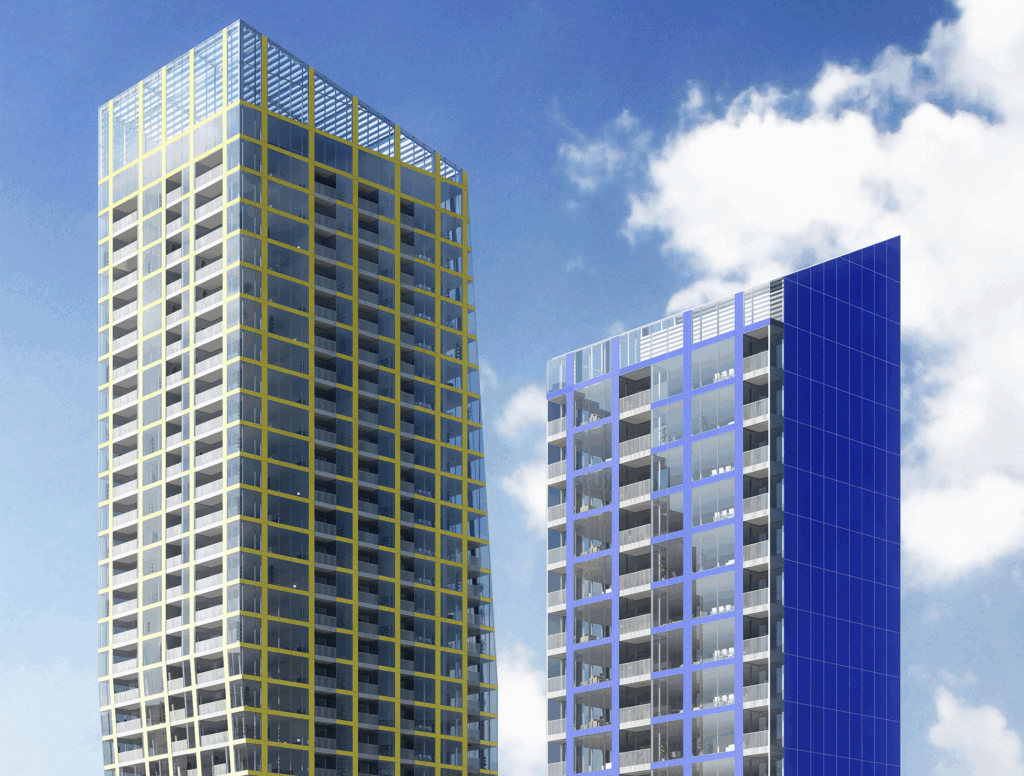 The towers are reinforced independently by a diagonal steel-bracing system, working in tandem with composite columns and concrete slabs. Their facades feature fixed triple-glazed windows and operable double-glazed windows shaded by perforated steel panels, which enhance energy efficiency and tenant comfort. With adjacency to the Autobahn, the windows are also designed to provide acoustical buffering from the noise below. Inside, the heating and cooling system is integrated into the building’s concrete structure, providing seamless conditioning.