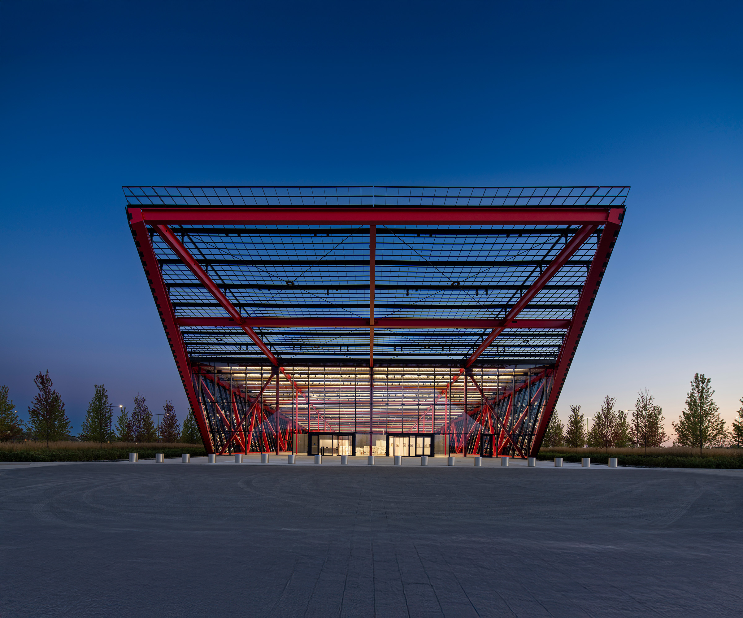 The Pritzker Military Archives Center is based on a 36’ structural grid system where the architecture and the structure are expressed and speak the same language. The side walls are steel trusses that support the roof system and provide the lateral stability required. A great roof cantilevers to frame an outdoor exhibit space, presenting an open and inviting image to guests and creating a prominent and impactful marker on the landscape. Its elevated roof and expansive interior space maximize functional efficiency and visual impact, providing ideal working conditions for staff while inspiring visitors.