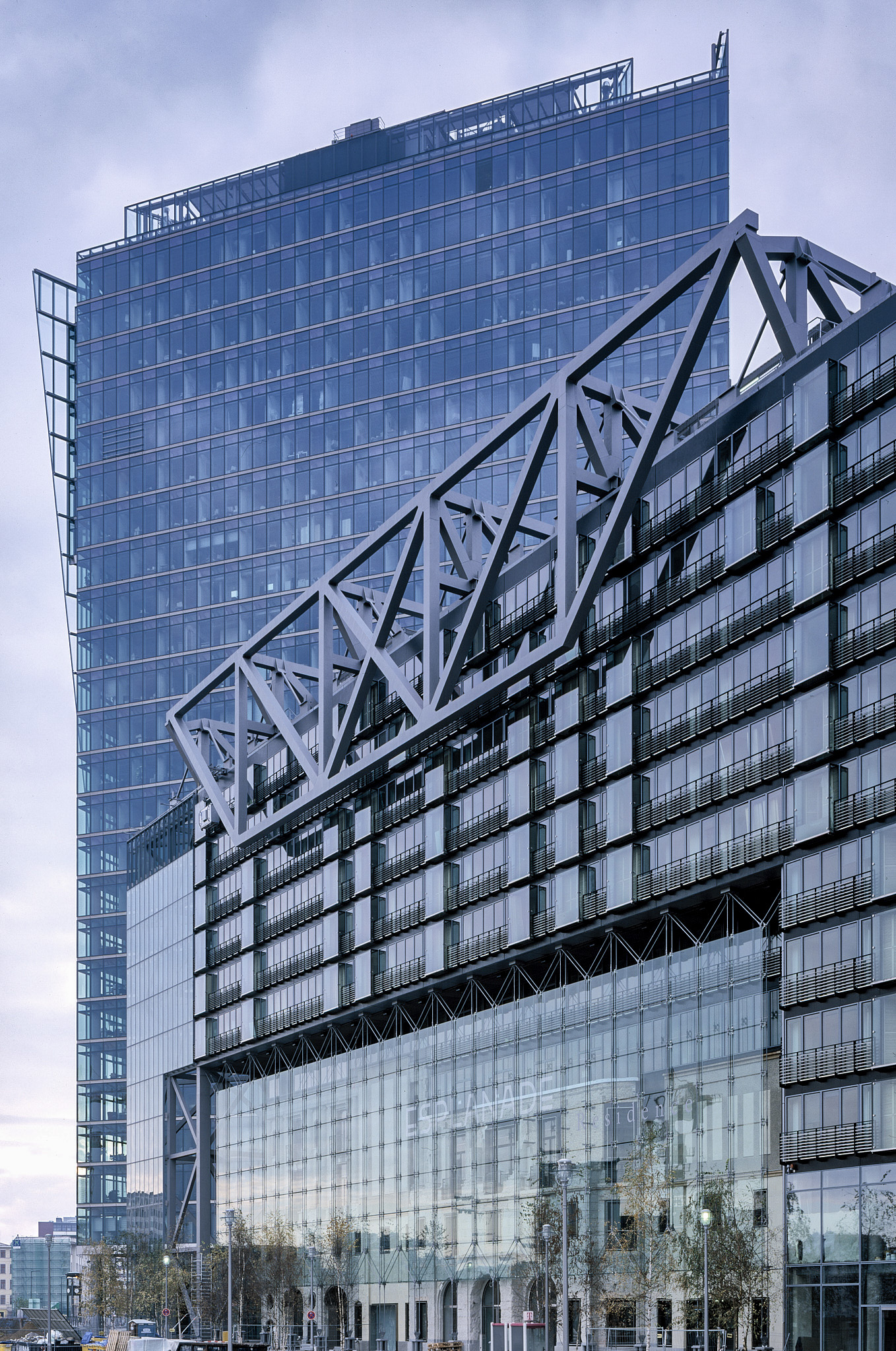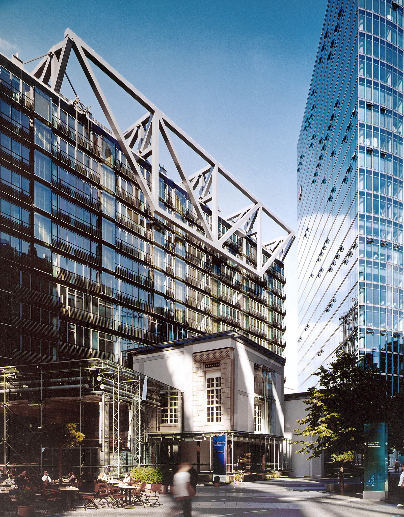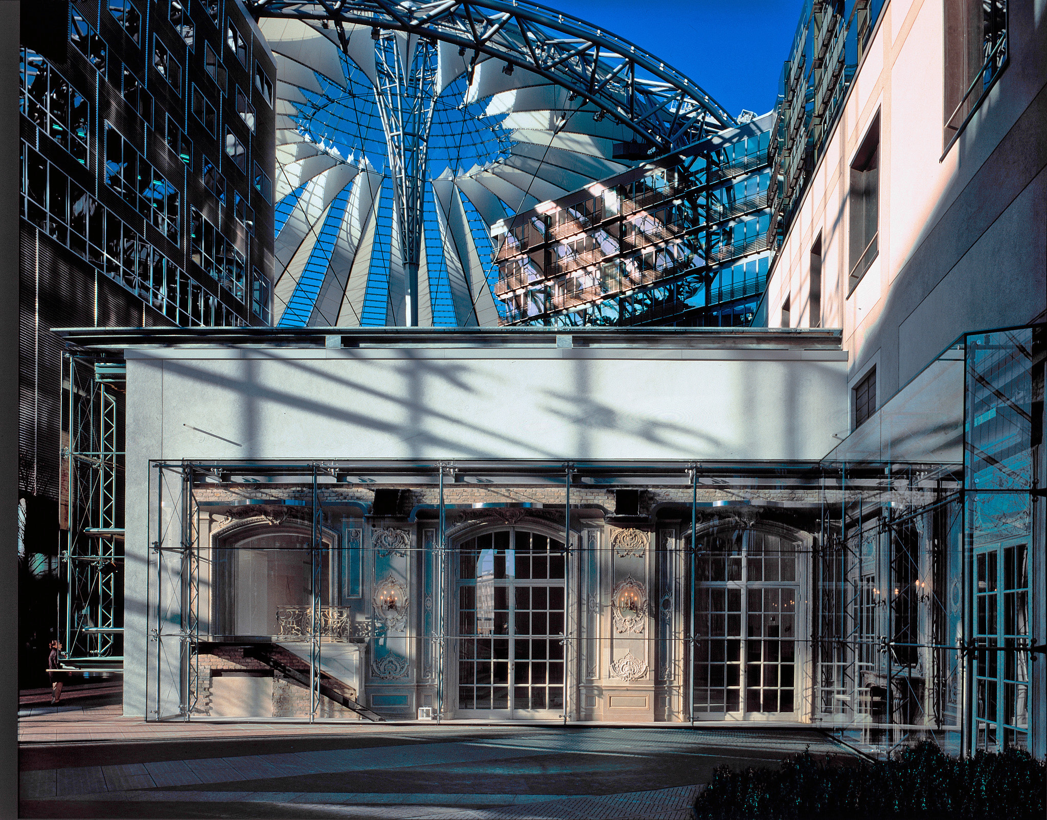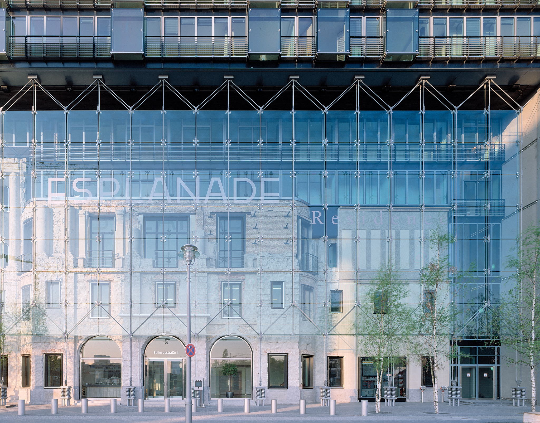 The ‘Esplanade Residence’ incorporates the historic and salvageable parts of the landmark Esplanade Hotel. The restoration tells the story of the Esplanade from its days as the Grand Hotel of Berlin through its destruction in the war and its initial repair during the days of the Berlin Wall. The entry sequence of Eingangshalle, Silbersaal, and Palmenhof are retained. The Frühstücksraum has been moved in part and reassembled in a glass pavilion, and the Kaisersaal was moved in its entirety. The remaining exposed interior walls are displayed behind glass vitrines along with translocated pieces, accentuating the passage from the Potsdamer Platz to the forum. The new apartments are suspended from a large truss above the existing building, giving a powerful message of the tension between old and new. A large cable-supported glass screen displays the layers of history of the main façade like a large vitrine.