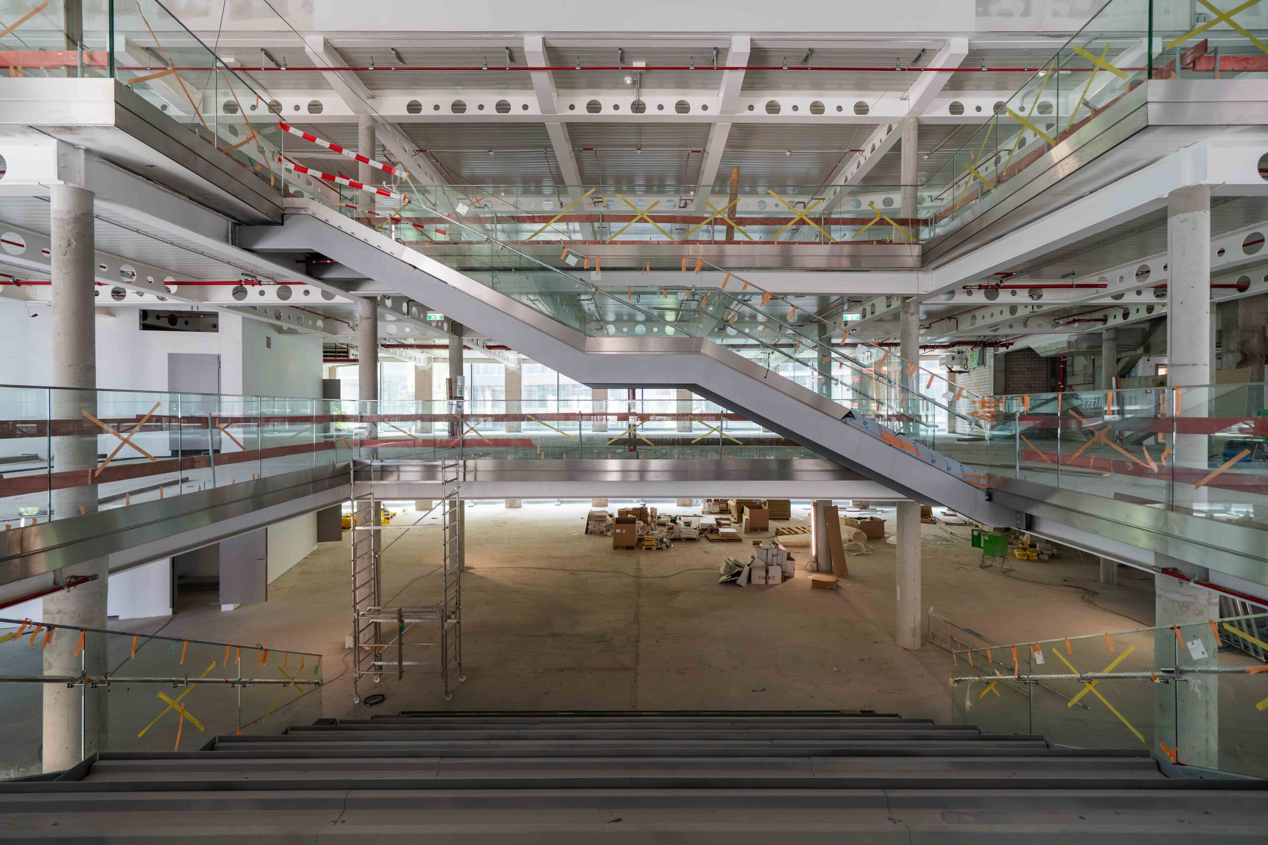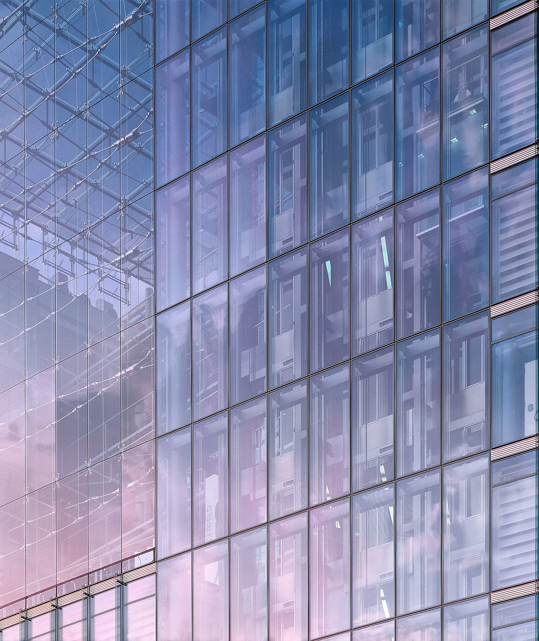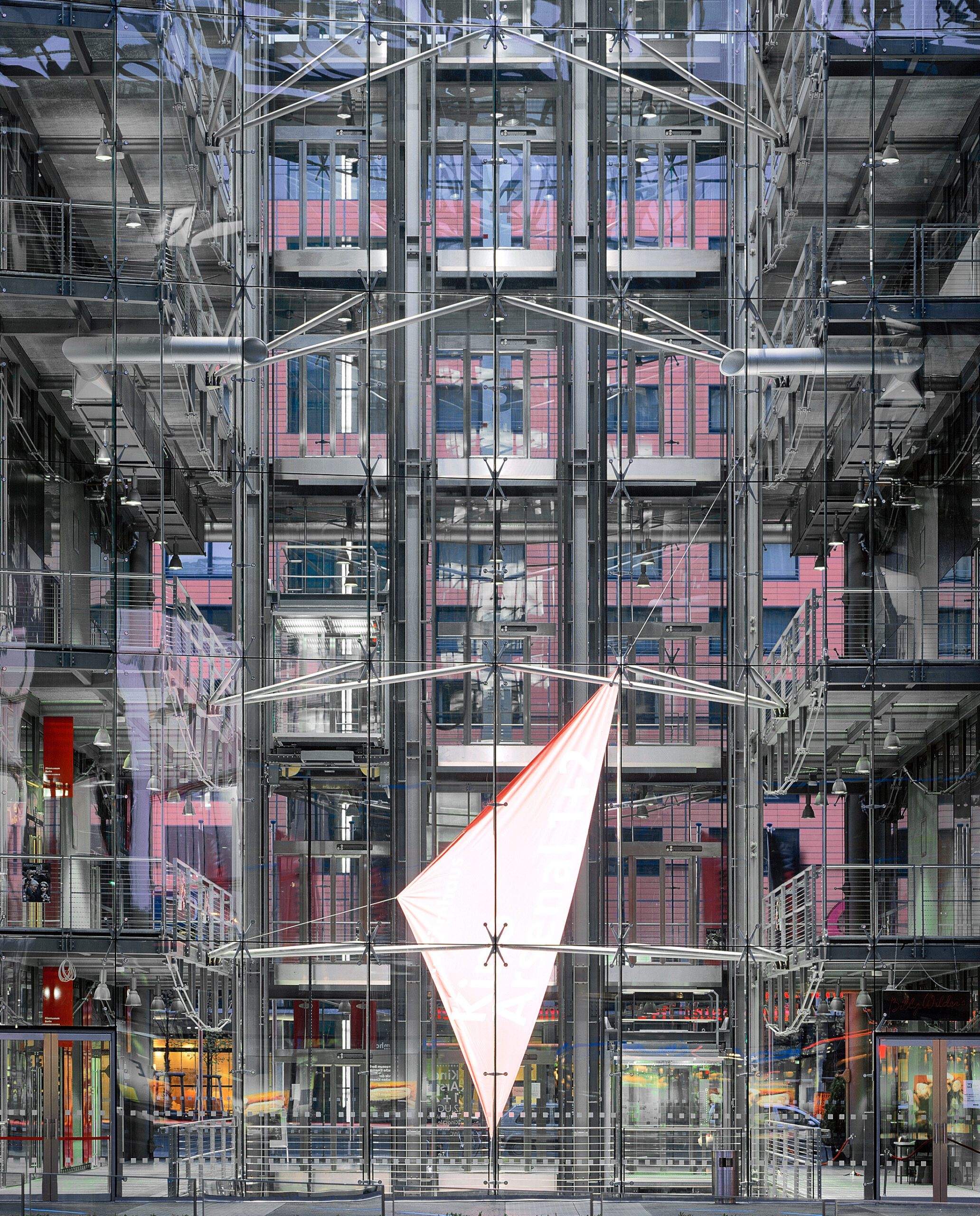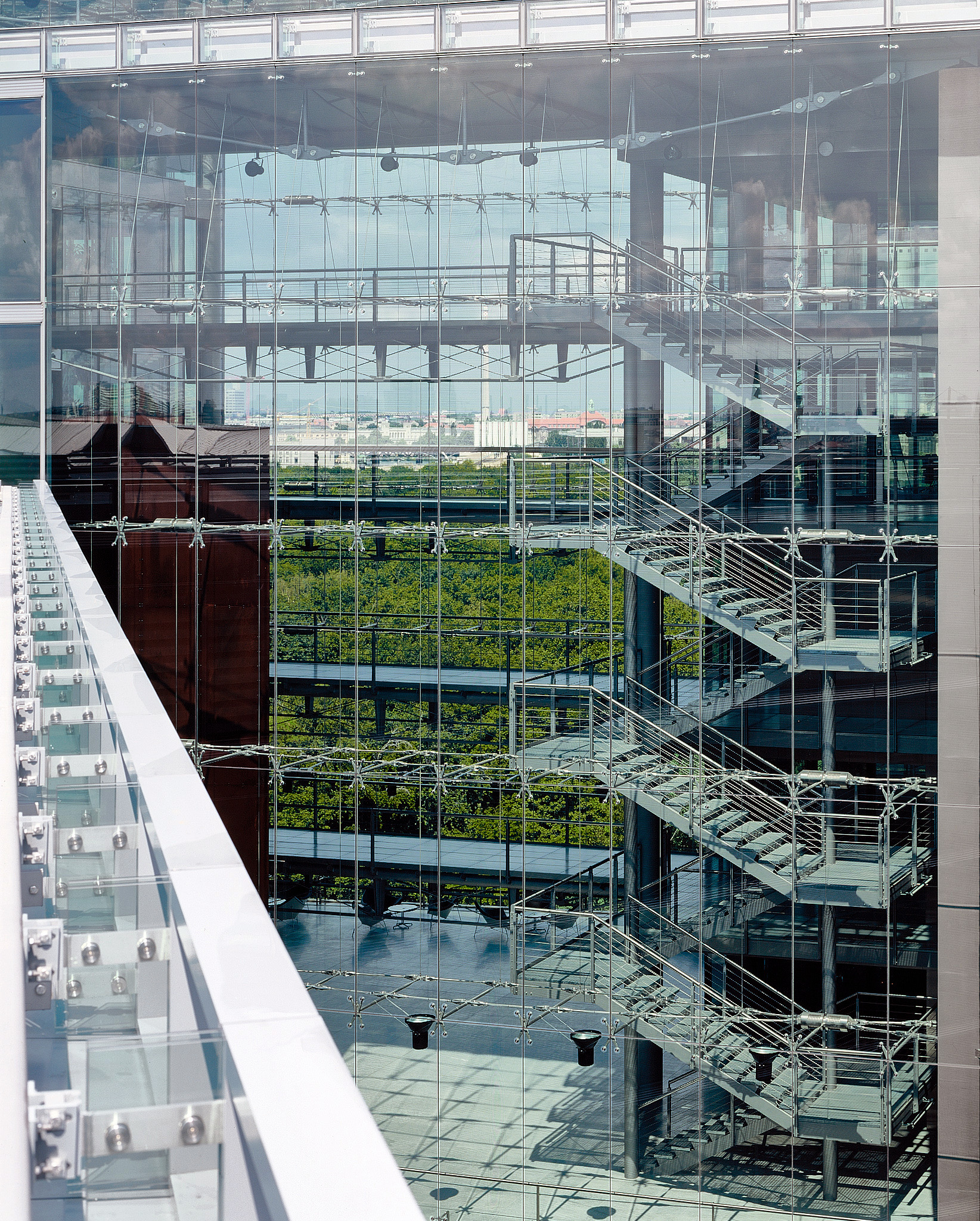 The ‘Esplanade Residence’ incorporates the historic and salvageable parts of the landmark Esplanade Hotel. The restoration tells the story of the Esplanade from its days as the Grand Hotel of Berlin through its destruction in the war and its initial repair during the days of the Berlin Wall. The entry sequence of Eingangshalle, Silbersaal, and Palmenhof are retained. The Frühstücksraum has been moved in part and reassembled in a glass pavilion, and the Kaisersaal was moved in its entirety. The remaining exposed interior walls are displayed behind glass vitrines along with translocated pieces, accentuating the passage from the Potsdamer Platz to the forum. The new apartments are suspended from a large truss above the existing building, giving a powerful message of the tension between old and new. A large cable-supported glass screen displays the layers of history of the main façade like a large vitrine.