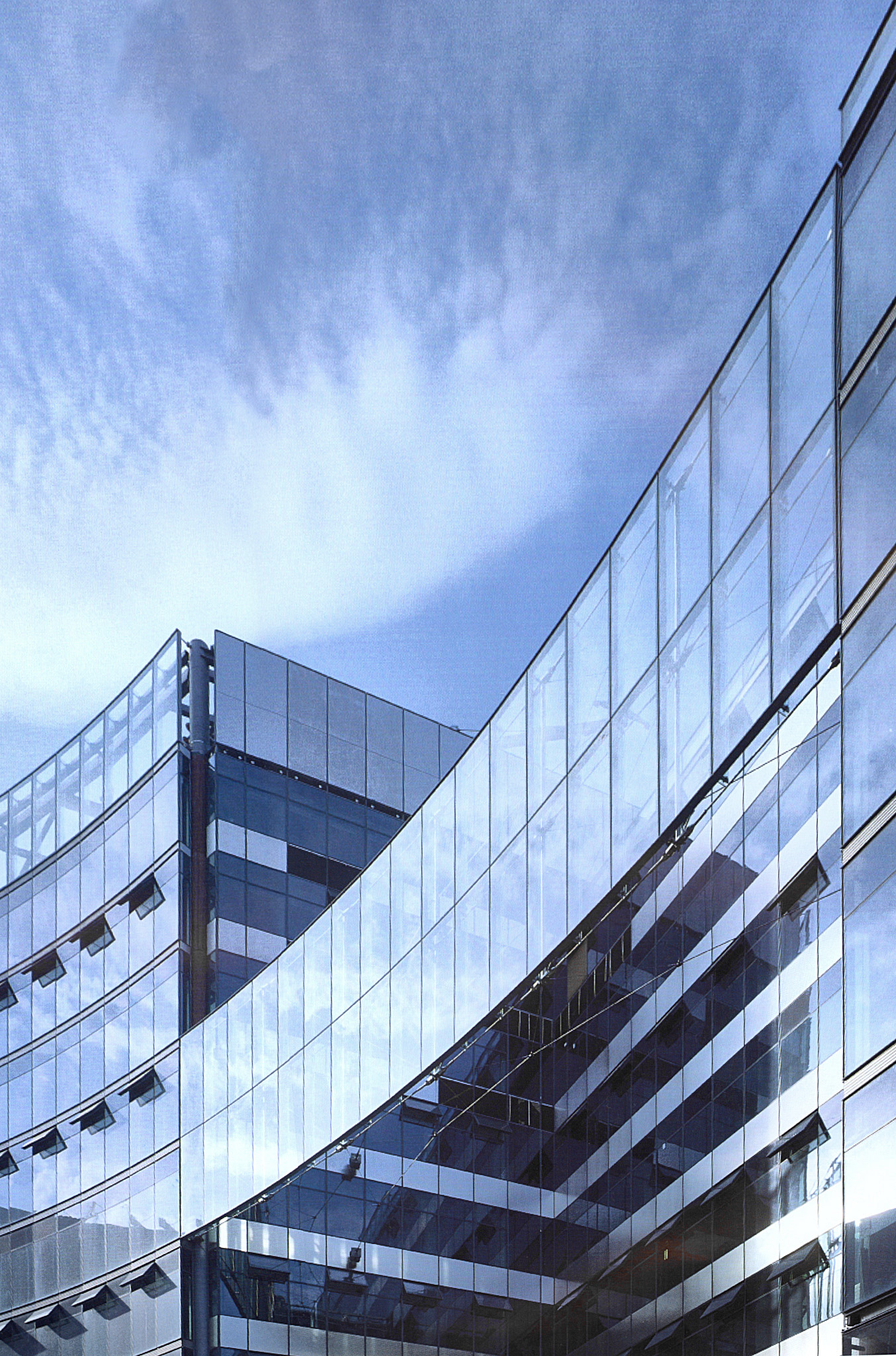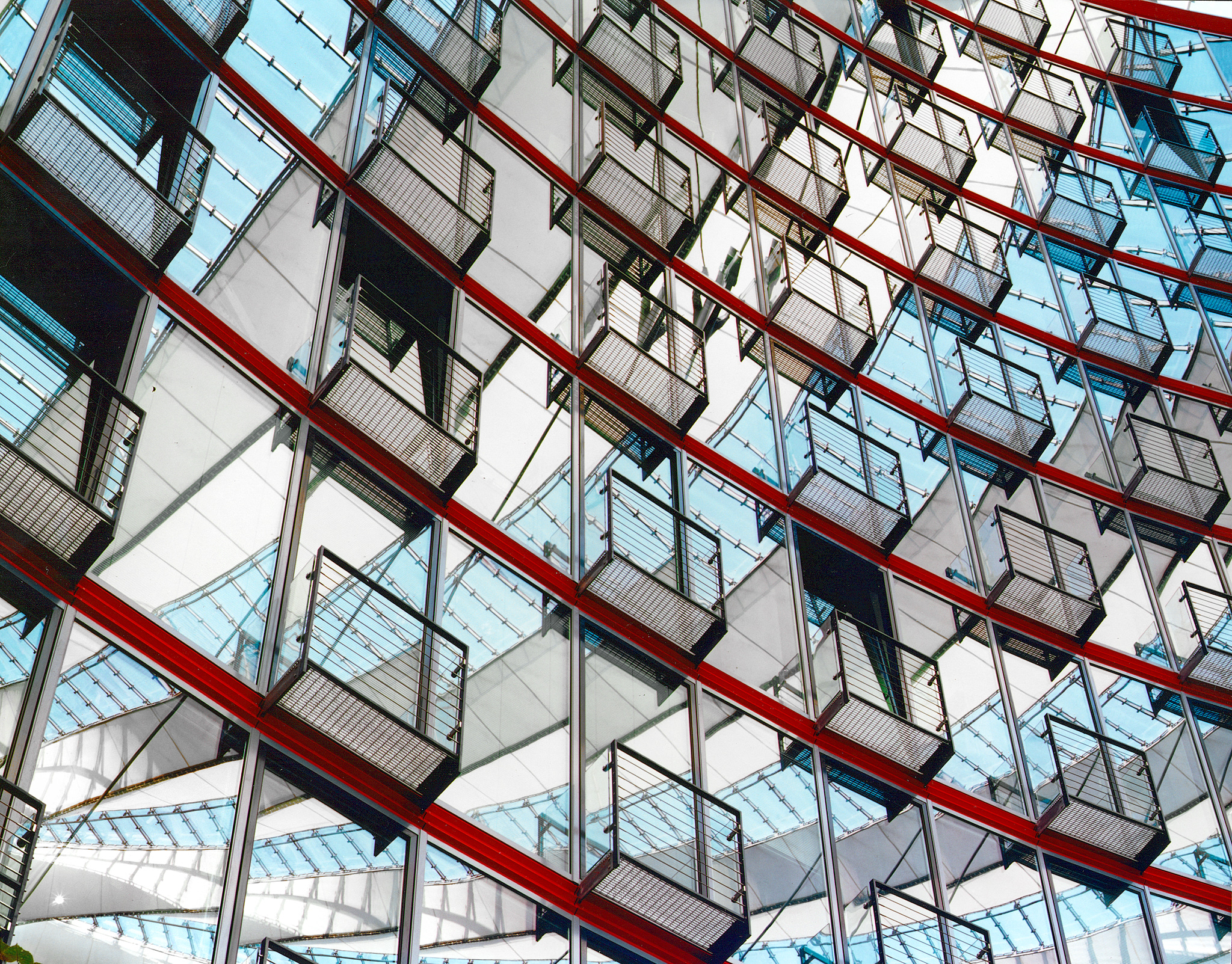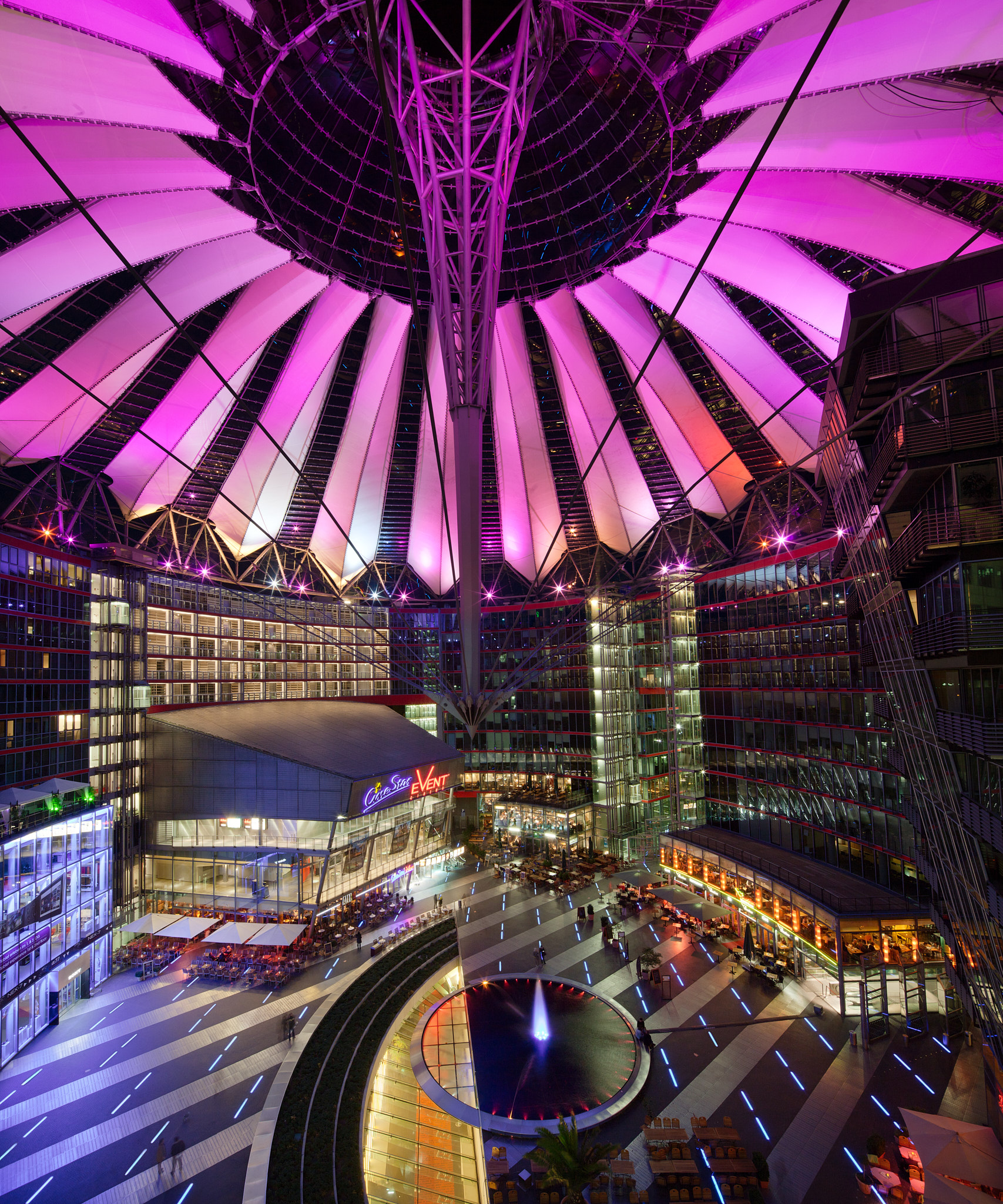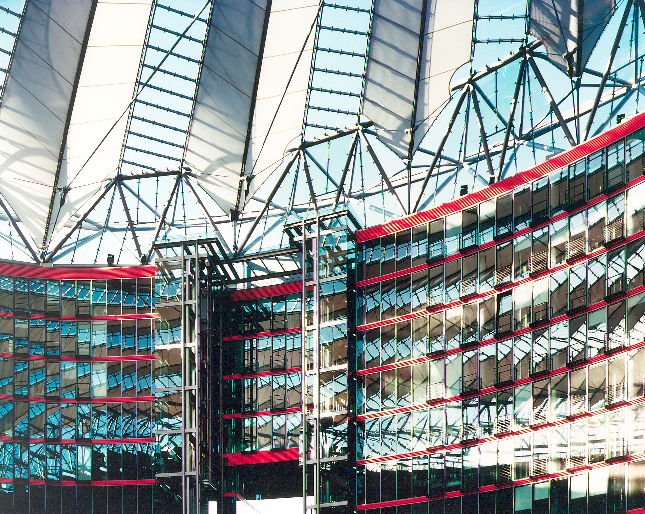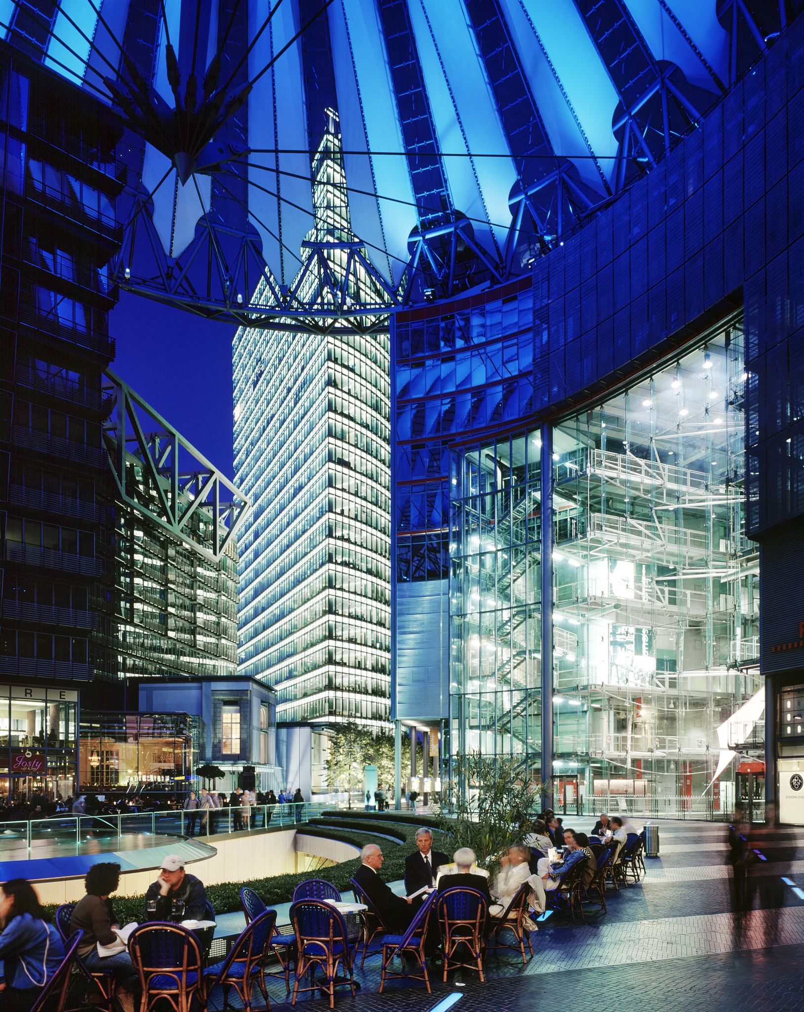 The spatial dynamics and variety are contrasted by a minimal and technological attitude. Light, both natural and artificial, is the essence of the design. Sony Center is luminous, not illuminated. Façades and roof act as a fabric, which moderates the natural and artificial light. With its characteristics of transparency, permeability to light, reflection, and refraction, there is a constant change of images and effects during day and night, effecting not only the appearance but also maximizing the comfort and minimizing the use of resources.